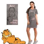 Conforto e praticidade unidos com beleza e diversão. Esse é um modelo de camisola estilo t-shirt. O gato mais preguiçoso e comilão dos quadrinhos já se fez presente em 2570 jornais ao redor do mundo, um sucesso. Além de conquistar o mundo todo também conquista os fanáticos por pijamas que simpatizam com a preguiça do bichano.