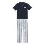 Dias frescos pedem esse confortável pijama, com calça listrada e camiseta manga curta lisa e gola v, que se diferencia pelo bolso lateral com aplicação de detalhe no mesmo tecido da calça. Disponível em cores neutras e sóbrias e confeccionado em malha e viscose plana – tecido de caimento leve, macio, com boa fluidez e extremamente confortável.